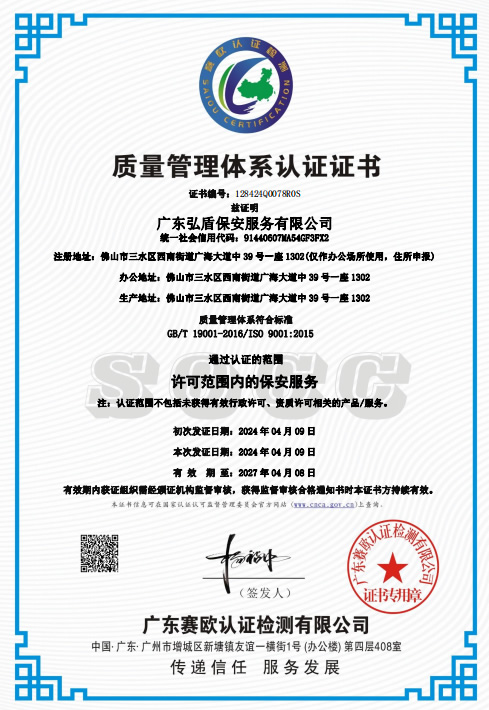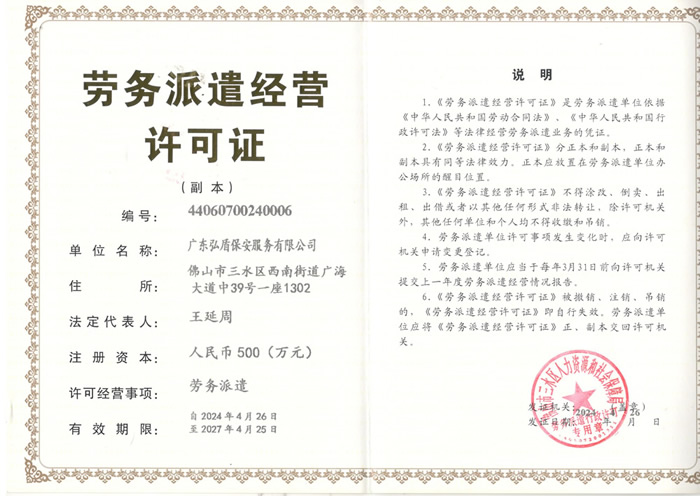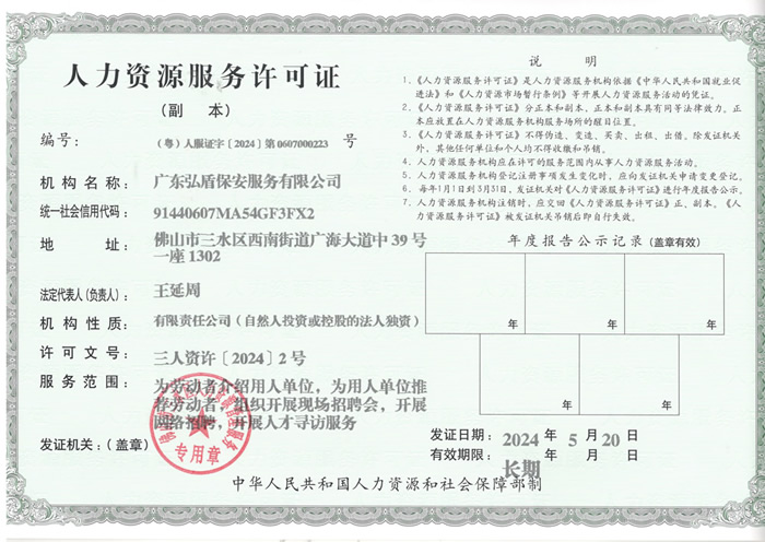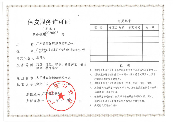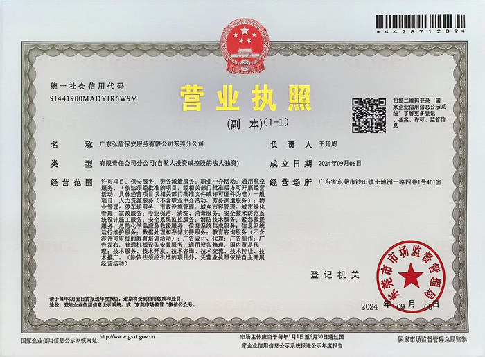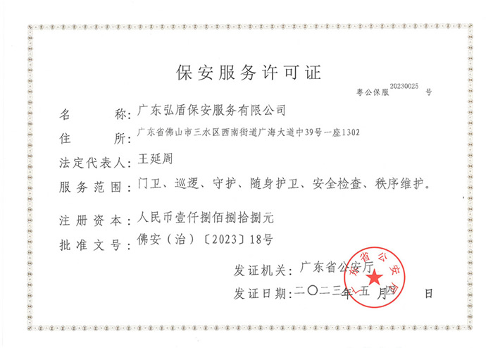 - 廣東弘盾保安服務(wù)有限公司東莞分公司是經(jīng)東莞市公安局嚴(yán)格審核,廣東省公安廳批準(zhǔn)頒發(fā)《保安服務(wù)許可證》,在東莞市工商行政管理機(jī)關(guān)登記注冊的,依法開展門衛(wèi)、巡邏守護(hù)、秩序維護(hù)、隨身護(hù)衛(wèi),安全檢查等綜合安保服務(wù)的專業(yè)保安服務(wù)公司... [詳細(xì)介紹]